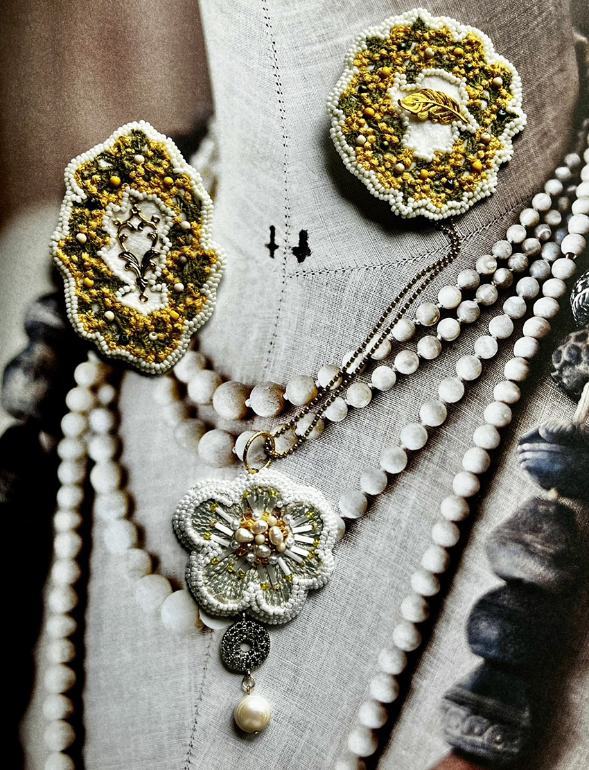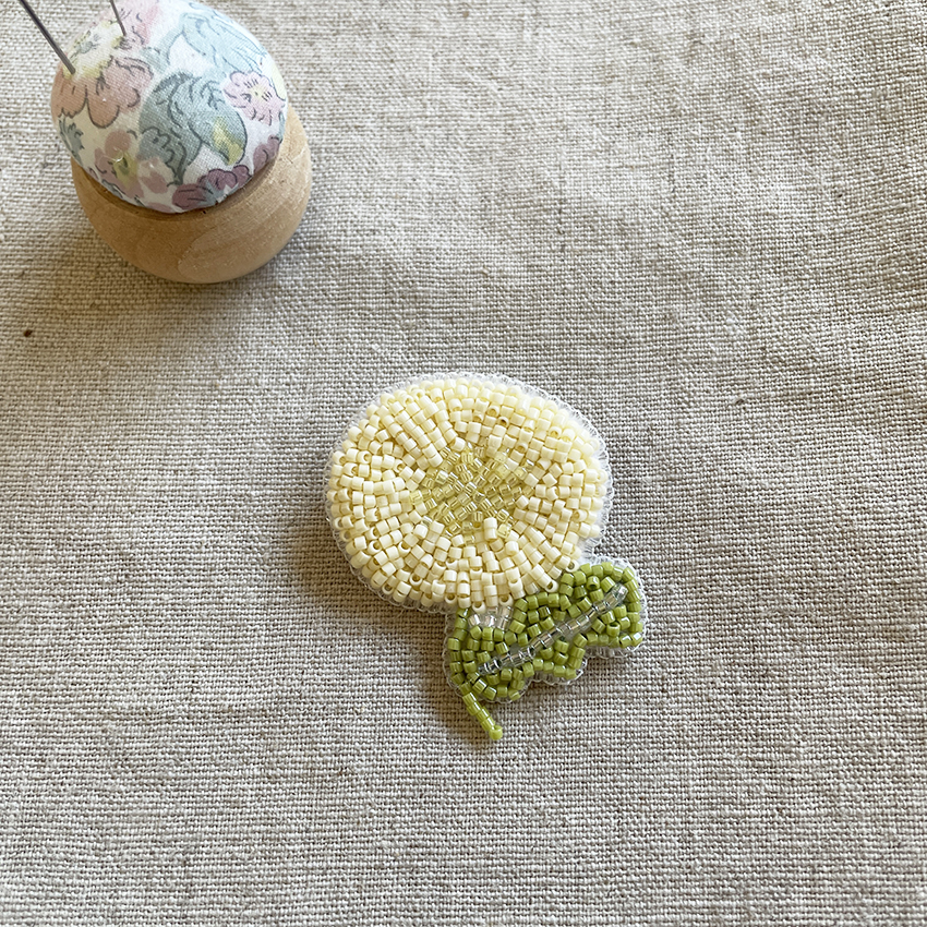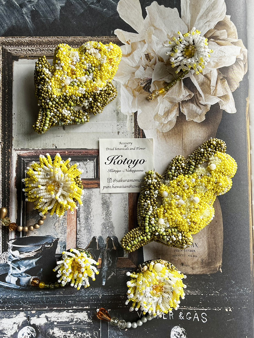 「ビーズ刺繍アクセサリーを作っています。一粒ずつ手縫いで仕立てています。」